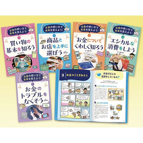 お金の使い方で未来を変えよう!(全5巻)シリーズ『①買い物の基本を知ろう 』『②商品とお店を上手に選ぼう』『③お金についてくわしく知ろう』『④エシカルな消費をしよう』『⑤お金のトラブルをなくそう』の全5巻セット。