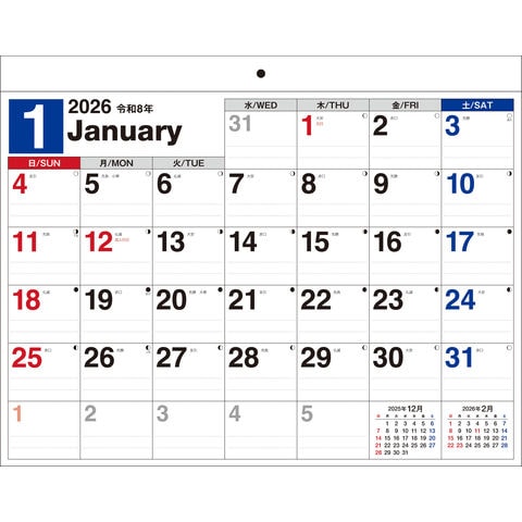 フラットで書き込みやすいリングレスB4ヨコカレンダーです。6週タイプ。3色印刷。六曜、二十四節気、月の満ち欠け入り。翌年の年間カレンダー付き。(B4ヨコ/3色/タテ287×ヨコ363ミリ)