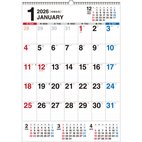 4ヵ月がパッと確認できる大判カレンダーです。5週6週混合タイプ。3色印刷。六曜、二十四節気、月相入り。翌年の年間カレンダー付き。(A2タテ/3色/タテ594×ヨコ420ミリ)