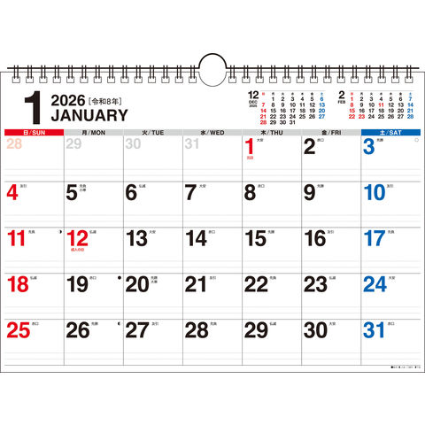 シンプルで書き込みやすい、壁掛けカレンダーです。5週6週混合タイプ。3色印刷。六曜、二十四節気、月相入り。翌年の年間カレンダー付き。(A4ヨコ/3色/タテ210×ヨコ297ミリ)