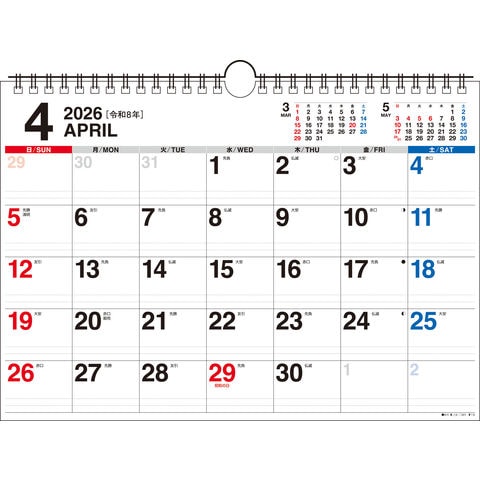 シンプルで書き込みやすい、4月始まり壁掛けカレンダーです。5週6週混合タイプ。3色印刷。六曜、二十四節気、月相入り。本年・翌年の年間カレンダー付き。