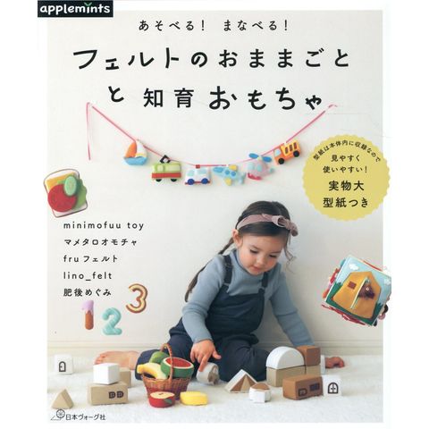 フェルト手芸は切りっぱなしでもよく、色数も豊富、ボンドで貼れるその手軽さから手芸はじめてさんでもとりかかりやすいのが魅力です。本書は、フェルトのみで作るおままごとと知育おもちゃの本。おままごとのできるアイテムや、赤ちゃんのガラガラやにぎにぎから積み木、ファスナーやボタン、スナップやマジックテープの練習ができる作品、遊びながら数字を覚え足し算や引き算ができたり、時計のおもちゃなど「あそんでまなべる」作品集です。著者は手芸作家、またフェルト型紙作家として活動する肥後めぐみさん、minimofuu_toyさん、マメタロオモチャさん、lino_feltさん、fru¬フェルトさん5名での共著です。