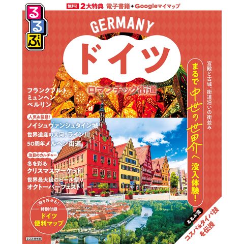 白亜のノイシュヴァンシュタイン城や美しい街道沿いの街並み、ライン川下りなどドイツ観光の必見スポットを押さえた決定版、フランクフルト、ミュンヘン、ベルリンなど都市情報も満載