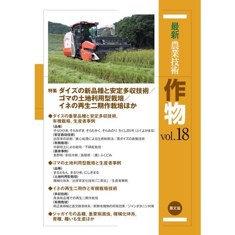 今号では、ダイズのほか、イネ、ゴマ、ムギ、サツマイモ、ジャガイモの品種や安定多収・有機栽培に関する技術を重点的に収録している。ダイズでは新品種の「そらシリーズ」(そらひびき、そらみずき、そらたかく、そらみのり)と「ちくしB5号(ふくよかまる)」、安定多収に向けた技術として摘心栽培や播種技術、重要病害虫とその対策、有機栽培体系、生産者事例を収録。イネでは良食味品種での再生二期作の要点や有機栽培に関連する技術、ゴマでは土地利用型栽培に向けた技術と生産者事例、重要品種を収録。ムギでは基本技術として播種と雑草対策、後期重点施肥に対応した倒伏回避技術、減化学肥料栽培、有機栽培、サツマイモでは新品種と基本技術、水田の多面的利用では地下かんがいと田んぼダムを収録した。そのほかカラー口絵では、ジャガイモの原産地、品種、重要病害虫、機械化体系、育種と種いも生産の基本などを解説した。