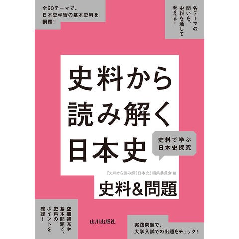 テーマ(問い)に関係する史料を取り上げ、そこからどのようなことが読み取れるのかを考える。主要な史料をおさえた全60テーマ。それぞれ見開きで、「史料」とその口語訳、「テーマの考え方」、史料に関する「基本問題」、大学入試の過去問をつかった「実践問題」で構成。
