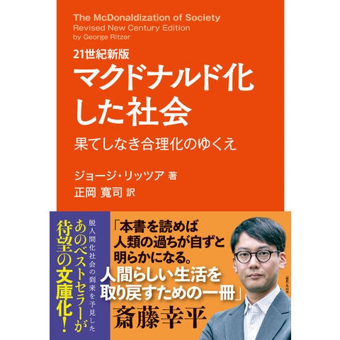 2008年10月に刊行し大好評を得た同名単行本が、満を持して文庫化! マックス・ウェーバーの近代合理化理論の現代版として展開される脱人間化社会の理論「マクドナルド化」。その骨子は、「効率性」「計算可能性」「予測可能性」「制御」の4つの次元にあったが、本書では原書が刊行された2004年当時の時代的要請に応え、「合理性のもたらす非合理性」という新たな次元についても検討が加えられている(7章)。さらには、グローバル化(globalization)が進行するなか、世界の均質化が進むいっぽうで新たな地域性も生まれるという一見矛盾する状況に対し、リッツアは「グローカル化(glocalization)←→グロースバル化(grobalization[リッツアによるgrowthからの造語])」と「存在(something)←→無(nothing)」という2つの座標軸を用いながらユニークな分析を加えたうえで、脱人間化社会に対する抵抗を試みる――真に人間らしい社会を希求する人びとにとって必読の書。