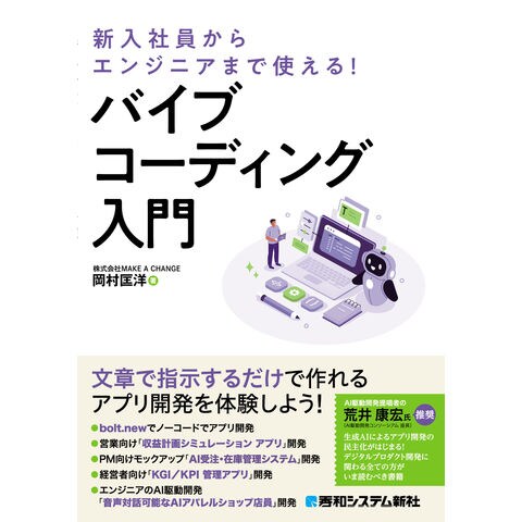 「バイブコーディング(Vibe Cording)」をテーマにした書籍です。「生成AIのおかげで、誰でも文章で指示することアプリが作れる」という内容で、様々な業務アプリをプログラミングなしで作ることを目的とします。bolt.newというツールを使い、モックアップアプリの作り方から、完全に動作する「収益計画シミュレーション アプリ」「KGI/KPI 管理アプリ」などのアプリをハンズオンで開発していきます。ノーコードで作るため非エンジニア職からエンジニアまで幅広く読める内容です。