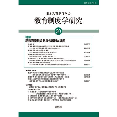 「特集 新教育委員会制度の展開と課題」や学会大会での公開シンポジウム「教育理論から教育システムを構想する」などを収録した最新の教育制度学研究動向が分かる教育制度学研究第30号。
