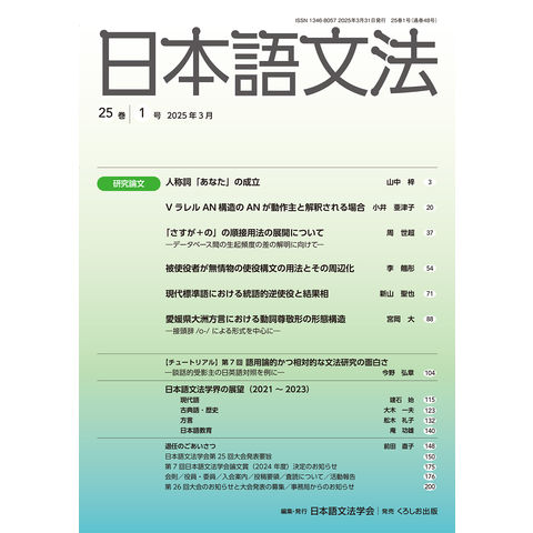 学会誌『日本語文法』25巻1号。山中梓/小井亜津子/周世超/李翹〓/新山聖也/宮岡大/今野弘章/建石始/大木一夫ほか