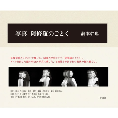 2025年1月9日にNetflixより世界独占配信されるドラマ「阿修羅のごとく」。脚本家・向田邦子の代表作と言える名作ドラマが、長女に宮沢りえ、次女に尾野真千子、三女に蒼井優、四女に広瀬すずの豪華キャストを迎え、是枝裕和監督の手で令和に蘇ります。本書は、『空気人形』『三度目の殺人』『海街diary』など是枝監督作品の撮影を任されてきた写真家・瀧本幹也がドラマ撮影と並行してとらえた数々のカットを1冊に収めました。刻々と移ろう四姉妹の表情や、舞台である1979年に一瞬にして引き込まれるような場面写真など、ドラマを観た方にもそうでない方にも楽しめる写真集です。葛西薫による上品かつ凛々しいデザインが作品を一層際立たせます。