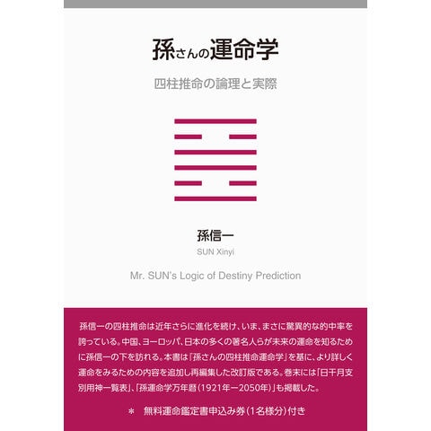 孫信一の四柱推命は近年さらに進化を続け、いま、まさに驚異的な的中率を誇っている。中国、ヨーロッパ、日本の多くの著名人らが未来の運命を知るために孫信一の下を訪れる。本書は『孫さんの四柱推命運命学』を基に、より詳しく運命をみるための内容を追加し再編集した改訂版である。巻末には「日干月支別用神一覧表」、「孫運命学万年暦(1921年ー2050年)」も掲載した。