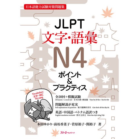 問題パートで問題を解き、わからない問題は解説とリストパートで確認、という流れで学習し、N4レベルの語彙と漢字を覚えます。学習語彙は、試験に出題される可能性の高い最重要語彙(245語)を様々な資料の分析に基づき厳選しました。漢字は、学習語彙に使用されている漢字の中から118字にしぼって取り上げ、漢字が苦手な学習者でも負担が少なく、効率よく学習を進めることができるようになっています。問題の解答・解説には英語、中国語、ベトナム語の翻訳が付いており、独習用としても使用できます。