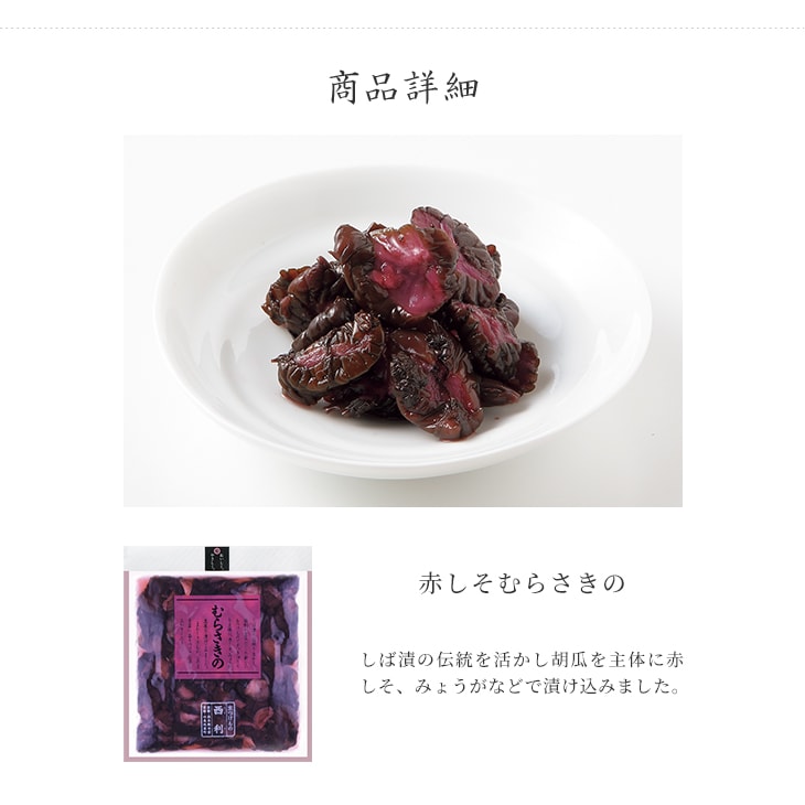 《赤しそむらさきの 100g》 しば漬の伝統を活かし、胡瓜を主体に赤しそ、みょうがなどを西利独自の漬け床で漬けあげました。 爽やかな風味と歯切れの良さをお楽しみください。 お弁当に添えて、おにぎりやお茶漬、ビールのおつまみにも嬉しいお漬物です。 ※ご自宅お届けの場合、ご注文いただいた商品を包装紙または専用ビニールで一括包装してお届けいたします。 (包装紙・ビニールをお選びいただくことはできかねますのであらかじめご了承ください。) ※手提げ袋は有料です。 ページ内の「手提げ袋について」のバナーから商品と一緒にお買い求めください。 |