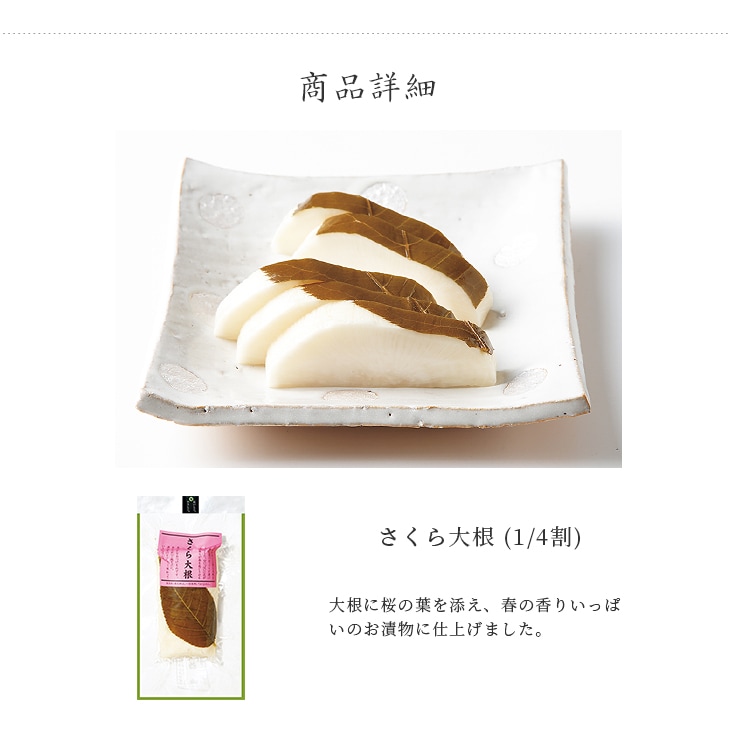 | 原材料 | 大根、漬け原材料(調味酢、糖類(砂糖、オリゴ糖)、発酵調味料、食塩、桜の葉、昆布エキス、昆布)/調味料(アミノ酸)、ソルビトール、酸味料 |
