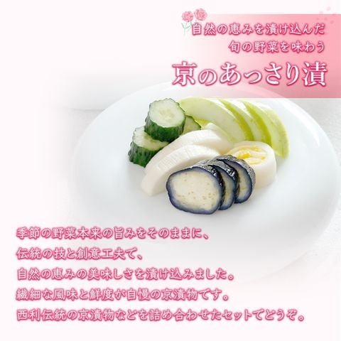 千枚漬70g、京のあっさり漬うすぎり大根115g、、ゆかりむらさき40g、さくら漬40g |