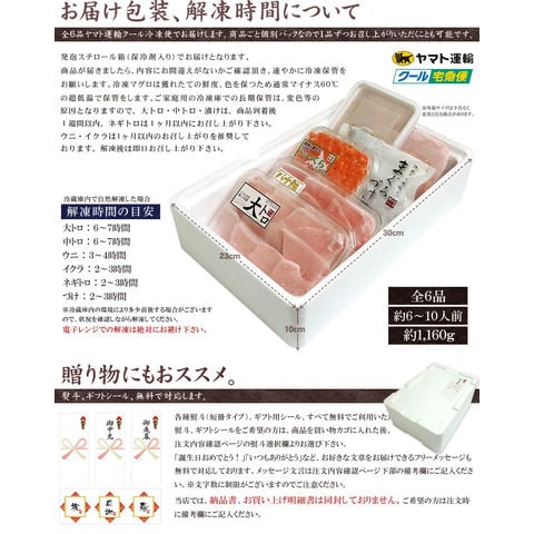 ■内容 大トロ入り海鮮福袋 増量版 ■内容量 本鮪大トロ100g×2、目鉢マグロ中トロ100g×2、無添加お刺身ウニ100g×2、 いくら醤油漬け70g×2、天然マグロネギトロ100g×2、天然マグロづけ110g×2 ■賞味期限 <大トロ、中トロ、づけ> 冷凍庫保存で約1週間、解凍後即日 <ネギトロ> 冷凍庫保存で約1ヶ月、解凍後即日 <ウニ、イクラ> 商品に記載。※お届け後、冷凍保存で約1ヶ月推奨。解凍後即日 ■保存方法 -18℃以下で保存 ■解凍方法 冷蔵庫内で自然解凍後そのままお召し上がりいただけます。 ■産地・原材料 大トロ:本マグロ・地中海産養殖、又は太平洋産養殖(マルタ・メキシコ等)、植物油脂、精製魚油/pH調整剤、酸化防止剤(V、C・V、E) 中トロ:バチまぐろ(産地:日本、台湾、韓国等)、植物油脂、精製魚油/pH調整剤、酸化防止剤(V.C、V.E) ウニ:雲丹(チリ産)、食塩 イクラ:いくら(鮭の卵(アメリカ産))、醤油加工品(小麦・大豆を含む)、醤油(小麦・大豆を含む) ※入荷状況により一部原材料が変更となる場合がございます。 ネギトロ:鮪(黄肌鮪・目鉢鮪、びんちょう鮪、産地:日本・台湾・他)、植物油脂/pH調整剤、酸化防止剤(VC・VE) まぐろづけ:メバチマグロ(産地:日本・韓国・その他)、タレ(醤油、みりん、砂糖、魚醤、酵造酢、魚介エキス、昆布エキス、酵母エキス、増粘剤(加工澱粉))(原料の一部に小麦、鯖、大豆含む) ■送料 送料無料(ヤマト運輸冷凍便) ※沖縄県へのお届けは別途送料800円頂戴します。 ■注意事項 〇商品は冷凍状態で発送致します。〇冷凍マグロの賞味期限は家庭用の冷凍庫の場合、約1週間程度となりますのでご注意ください。 ■発送タイプ:冷凍 |