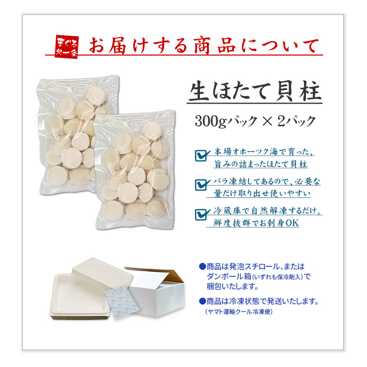 北海道産 生ホタテ貝柱 600g(300g×2パック) お刺身 送料無料 [[生ほたて300g-2p]