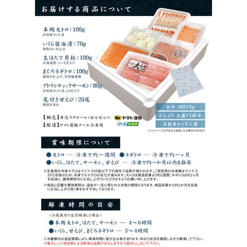 ■内容 海鮮六色丼セット ■内容量 本鮪大トロ100g いくら醤油漬け70g 北海道産生ほたて貝柱100g(5~8玉) お刺身サーモン80g(10切入) 天然マグロネギトロ100g 尾付き剥き甘えび20尾 ■賞味期限 <本鮪大トロ> 冷凍庫保存で約1週間、解凍後即日 <ネギトロ> 冷凍庫保存で約1ヶ月、解凍後即日 <ホタテ、イクラ、サーモン、甘えび> 商品に記載 ※お届け後、冷凍保存で約1ヶ月推奨。解凍後即日 ■解凍方法 全商品、自然解凍後そのままお召し上がりいただけます。 ■送料 送料無料(ヤマト運輸冷凍便) ※沖縄県へのお届けは別途送料800円頂戴します。 ■産地・原材料 【大トロ】本マグロ・地中海産養殖、又は太平洋産養殖(マルタ・メキシコ等)、植物油脂、精製魚油/pH調整剤、酸化防止剤(V、C・V、E) 【いくら】いくら(鮭の卵(アメリカ産))、醤油加工品(小麦・大豆を含む)、醤油(小麦・大豆を含む)※入荷状況により一部原材料が変更となる場合がございます。 【ほたて】帆立貝(北海道産) 【サーモン】アトランティックサーモン(ノルウェー産・養殖) 【ネギトロ】鮪(黄肌鮪・目鉢鮪、びんちょう鮪、産地:日本・台湾・他)、植物油脂/pH調整剤、酸化防止剤(VC・VE) 【甘えび】アマエビ(産地:日本、グリーンランド、デンマーク、カナダ、他) ■注意事項 ●商品は冷凍状態で発送致します。 ●冷凍マグロの賞味期限は家庭用の冷凍庫の場合、約1週間程度となりますのでご注意ください。 ■発送タイプ:冷凍 |
