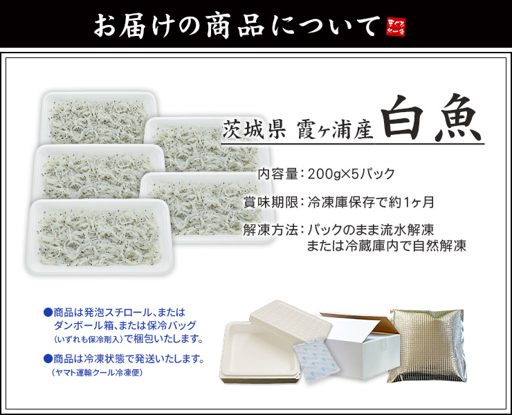 ■内容 白魚(生食用) ■内容量 1kg(200g×5パック) ■賞味期限 商品に記載、解凍後即日 ※お届け後、冷凍保管で約1ヶ月以内のご使用推奨しております。 ■保存方法 -18℃以下で保存 ■解凍方法 冷蔵庫内で自然解凍、またはパックのまま流水解凍 ■送料 送料無料(ヤマト運輸冷凍便) ※沖縄県へのお届けは別途送料800円頂戴します。 ■産地・原材料 しらうお(茨城県 霞ケ浦産) ■注意事項 ●商品は冷凍状態で発送致します。 ●本製品の白魚は、えび・かにが混ざる漁法で捕獲しています。 ■発送タイプ:冷凍 |