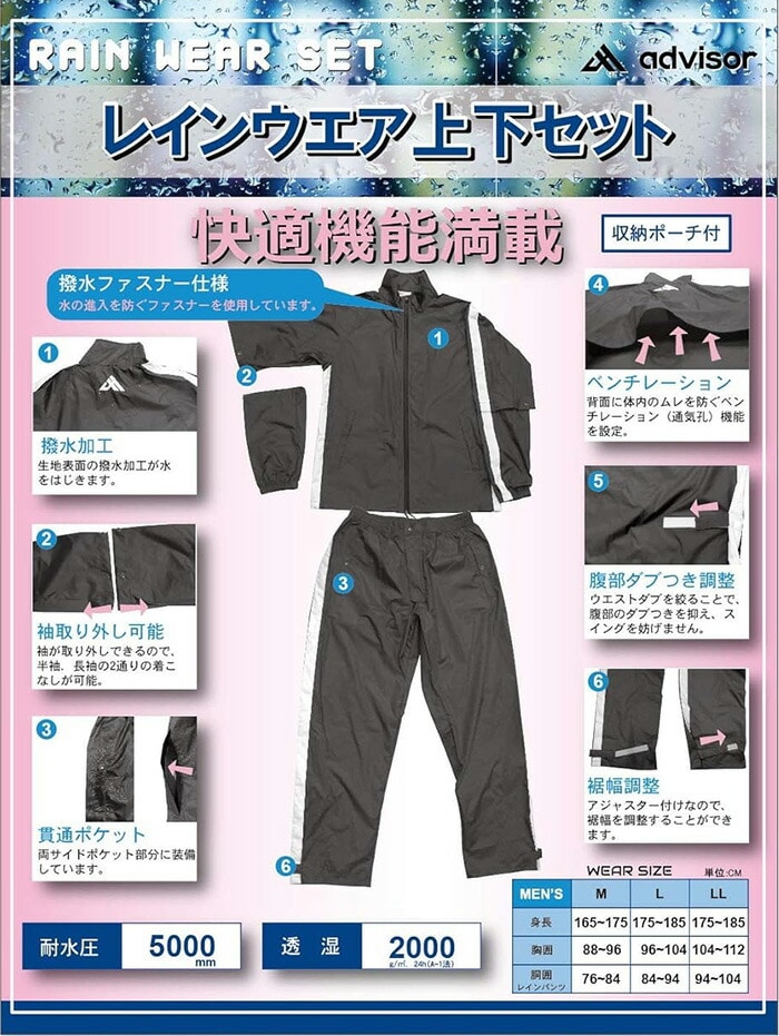 アドバイザー レインウェア上下セット ブルゾン パンツ セットアップ メンズ ADRW2020 レインコート レインスーツ 雨合羽 カッパ advisor お買い得