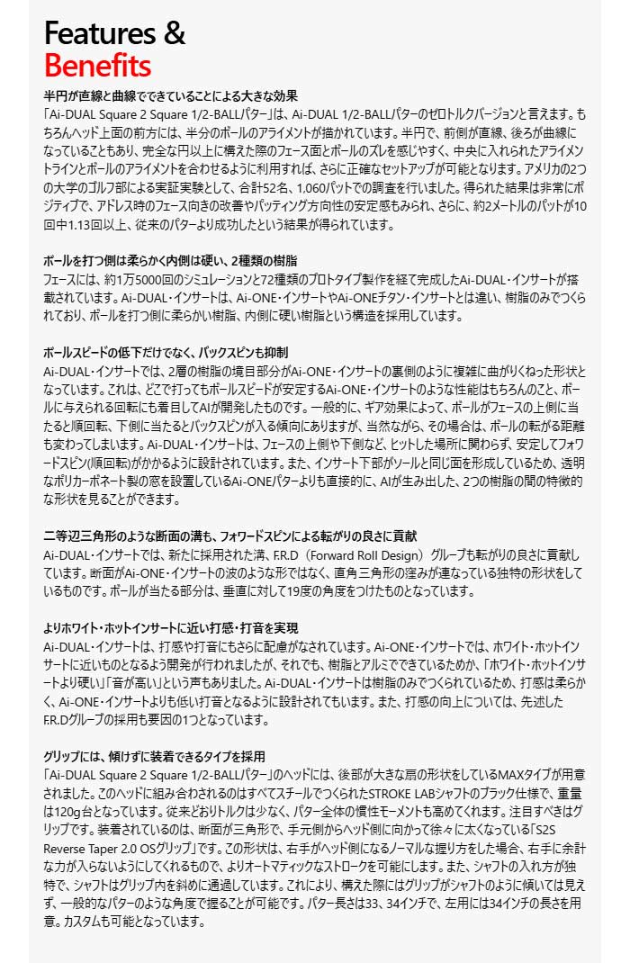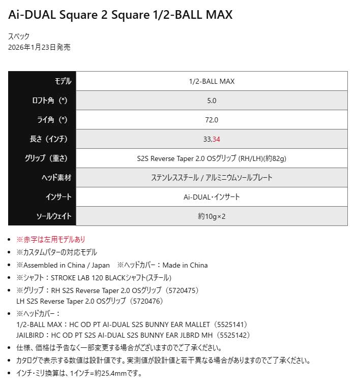 【レフティー】オデッセイ Ai-DUAL Square 2 Square 1/2-BALL MAX パター STROKE LAB 120 BLACK シャフト 2026年モデル ODYSSEY