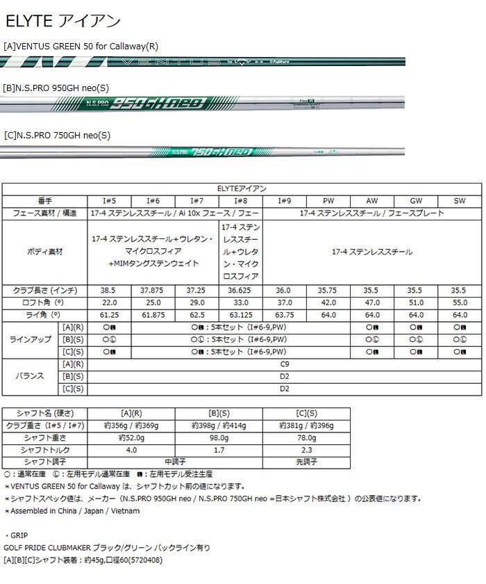 キャロウェイ ELYTE アイアン 単品(I#5、AW、GW、SW)VENTUS GREEN 50 for Callaway(R)カーボンシャフト 2025年モデル 日本仕様 Callaway エリート