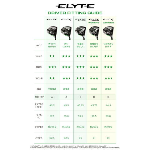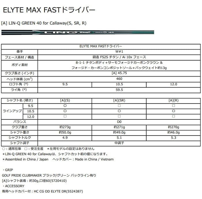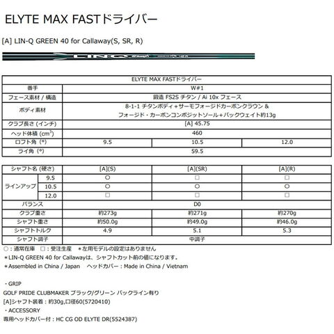 キャロウェイ ELYTE MAX FAST ドライバー LIN-Q GREEN 40 for Callaway カーボンシャフト 2025年モデル 日本仕様 Callaway エリート マックスファスト