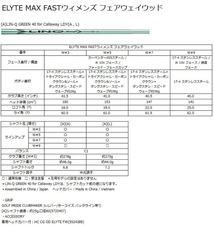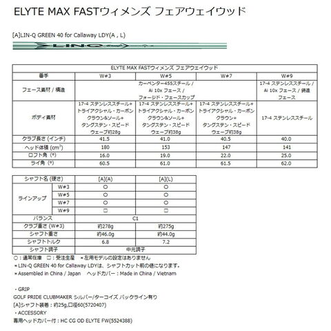 レディース キャロウェイ ELYTE MAX FAST フェアウェイウッド LIN-Q GREEN 40 for Callaway LDY カーボンシャフト 2025年モデル 日本仕様 Callaway エリート マックス ファスト 女性用