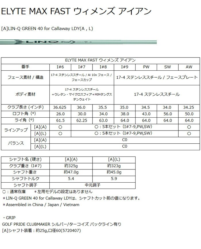 【レディース】キャロウェイ ELYTE MAX FAST アイアン 5本セット LIN-Q GREEN 40 for Callaway カーボンシャフト 2025年モデル