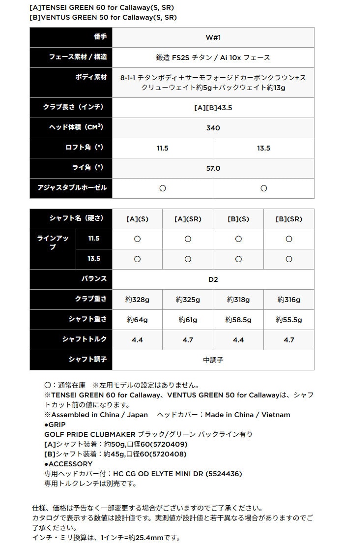 キャロウェイ ELYTE MINI ドライバー VENTUS GREEN 50 for Callaway カーボンシャフト 2025年モデル