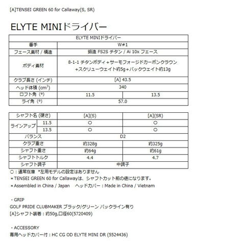 キャロウェイ ELYTE MINI ドライバー TENSEI GREEN 60 for Callaway カーボンシャフト 2025年モデル 日本仕様 Callaway エリート ミニドライバー