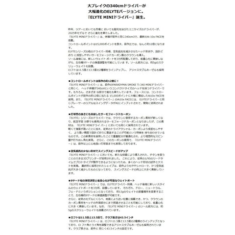 『ELYTE MINIドライバー』誕生。 昨年、ツアーにおいても市場に おいても脚光を浴びたミニサイズのドライバーが、2025年モデルで さらに進化を果たしました。 「ELYTE MINIドライバー」は、体積が前作と同じ340cm3で、最新のAi 10x FACEを搭載。 コントロールポイントは15,000ポイントを数え、前作比では、なんと約12倍になります。 ELYTEシリーズの他のドライバー同様、空気抵抗を減少させたヘッド形状や、設計どおり に成型しやすいサーモフォージドカーボン製のクラウンも導入。 ソール後端には、新しいウェイト ポートを3カ所配置しており、低重心化に貢献しながら、左右幅9ヤードの弾道調整を可能にしていま す。ソール前方には、約5gのスクリューウェイトも設置。 ロフトは11.5度と13.5度の2種類をラインアップし、 アジャスタブルホーゼルも採用しています。 ■コントロールポイントは前作の約12倍に! 「ELYTE MINIドライバー」は、前作のPARADYMAi SMOKE Ti 340 MINIドライバーと同じく、 ヘッド体積が340cnlというコンパクトサイズのヘッドを持つドライバーです。もちろん、さまざま な部分で進化も果たしています。フェースには、コントロールポイントが前作の約12倍に当たる 15,000ポイントに大幅に増加したAi10x FACEを採用。また、「ELYTE MINIドライバー」のAi10x FACEには、 ELYTEドライバーと同じプレーヤーのリアルなスイングデータがAIにインプットされて、開発に活用されました。 ■打球音の良さにも貢献したサーモフォージドカーボン 「ELYTE」シリーズのドライバーでは、クラウンに使用するカーボン素材が新しくなり、航空宇宙 分野でも使用されるサーモフォージドカーボンとなりましたが、この素材は、「ELYTE MINIドライ バー」においても同じく採用されています。 軽くて強度が高いことに加え、従来のトライアクシャル・カーボンより成型もしやすく、 より高い精度で設計どおりに製造することが可能という特徴を 持ち合わせているものです。この新素材を採用したことで重量配分が最適化され、より理想的なスピン量や打ち出し角も実現。 さらに、このカーボンの使用で、「ELYTE MINIドライバー」は、前作以上に心地良い打球音までも実現しております。 ■空気抵抗の少ない形状でスイングスピードがアップ 「ELYTE MINIドライバー」においても、新たな投資により導入された、チタンを扱うことのできる3Dプリン夕ーが活用されました。 これにより、従来の1/90のリードタイムでプロトタイプが製作できるようになったため、多くのヘッド形状の試作とテストを実施。 最終的に採用されたシェイプは、前作よりもややシャローで、かつ空気抵抗が大きく減少したものとなっており、 スイングスピードの向上に大きく貢献しています。 ■9ヤード幅の弾道調整と低重心化が可能なウェイトポート 「ELYTE MINIドライバー」では、ELYTEドライバー同様、ヘッド後端に新しいスタイルのウェイトポートを3カ所、設置しています。 それぞれ、ドロー、ニュートラル、フェードというポジションとなっており、 約13gのウェイトの装着場所を変更することで、左右幅約9ヤードの弾道調整が可能です。 さらに、従来のモデルにくらべ、地面により近い位置に搭載でき、かつ、クラウンのカーボン素材をヘッドの外周部分にまで到達させることも可能にしており、低重心化に大き く貢献しています。なお、「ELYTE MINIドライバー」のソール前方には、約Sgのスクリューウェイトも搭載されています。 ■ロフトは11.5度と13.5度で、クラブ長さは43.5インチ 「ELYTE MINIドライバー」は、ロフト11.5度と13.5度の2種類のラインアップとなっており、ロ フト角とライ角を調整できるアジャスタブルホーゼルも採用されています。クラブ長さは、前作と 同じく43.5インチの設定です。 |