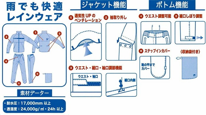 ウエスト・袖口はマジックテープで、裾口は内側スピンドルでしぼり調節が可能。