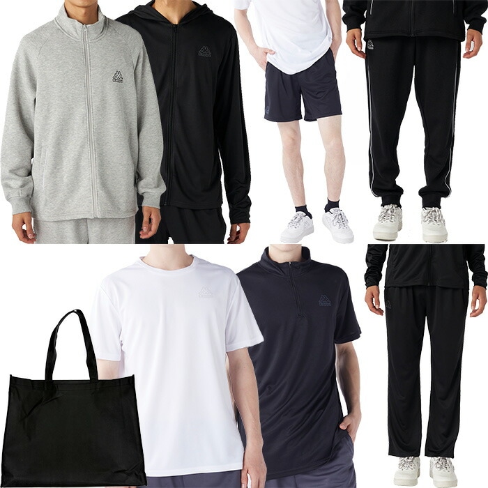 トラックジャケット、ロングパンツ、フルジップパーカー、 ストレートロングパンツ、半袖Tシャツ、 半袖ハーフジップシャツ、ハーフパンツの 7点セットの新春福袋です。 25,500円(税別)相当の商品が入っています。 |