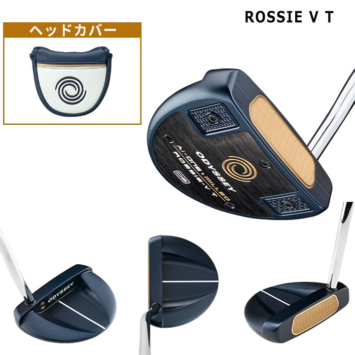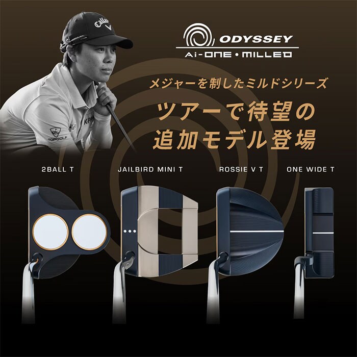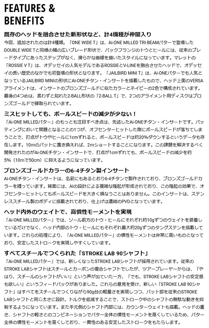 | 既存のヘッドを融合させた新形状など、 計4機種が仲間入り 今回、追加されたのは計4種類。「ONE WIDE T」は、Ai-ONE MILLED TRI-BEAMパターで登場したDOUBLE WIDE Tと同様の幅の広いブレード形状で、バックフランジのトウとヒールには、従来のブレードタイプにあったステップがなく、滑らかな曲線を描いたスタイルになっています。マレットの「ROSSIE V T」は、オデッセイの人気モデルであるROSSIEとV-LINEを融合させたヘッドで、オデッセイの長い歴史のなかでも初登場の形状となります。「JAILBIRD MINI T」は、Ai-ONEパターでも人気となっているJAILBIRD MINIの形状にAi-ONEチタン・インサートを搭載したもので、ヘッド上面のVERSAアライメントは、インサートのブロンズゴールドに似たカラーとネイビーの2色で構成されています。最後の4つめは、言わずと知れた2-BALL形状の「2-BALL T」で、2つのアライメント用ディスクはブロンズゴールドで縁取られています。 |
