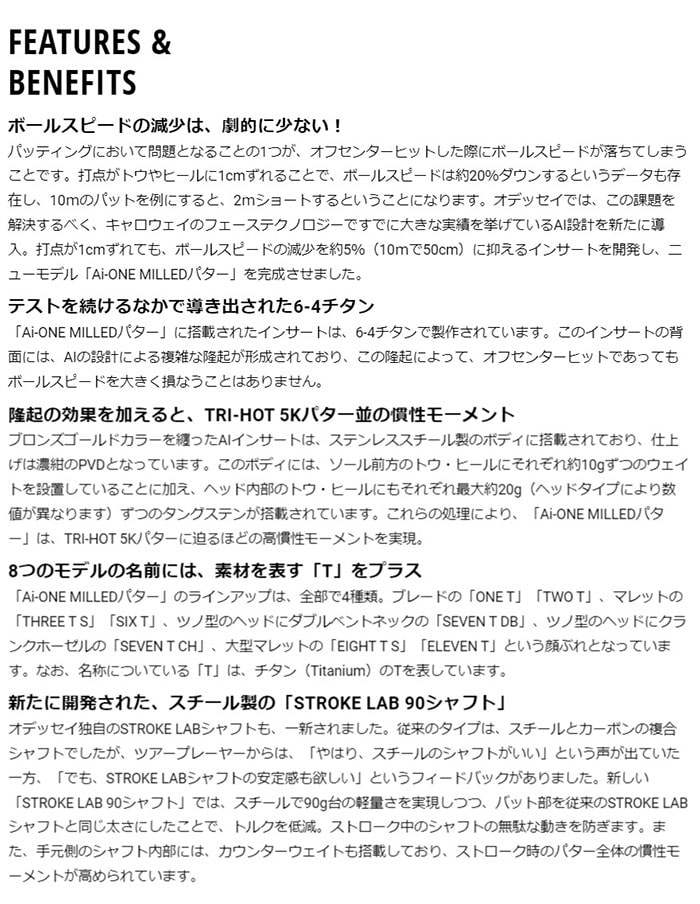 | AI設計のミルドインサートとウェイトで実現した、 モンスター級の超高慣性モーメント 「オフセンターヒットしてもボールスピードが減少しない」という条件を与えられてAIが設計した画期的なインサートは、Ai-ONEパターに採用された樹脂+アルミというバージョンだけではありません。削り出しパターのようなソリッドなフィーリングを愛するプレーヤーに向けて、6-4チタンインサートでも製作されたインサートを搭載し、「Ai-ONE MILLEDパター」として登場です。背面の複雑な隆起の効果で、打点が芯からずれても転がりが保たれるのが最大の特徴。。加えて、ステンレススチール製ボディの内外へ多くのウェイトを搭載したことにより、実質的には、超高慣性モーメントのヘッドに仕上がっていると言うことができます。組み合わされるのは、スチールだけでつくられた新開発のSTROKE LAB 90シャフト。ラインアップは、ブレードからマレットまで全8種類です。 |