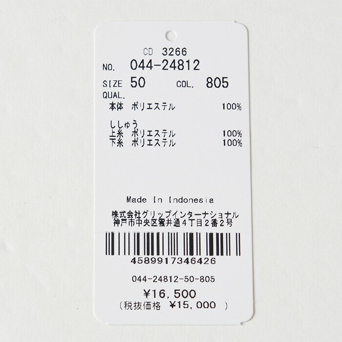 ししゅう糸:上糸 ポリエステル 100%/下糸 ポリエステル 100%