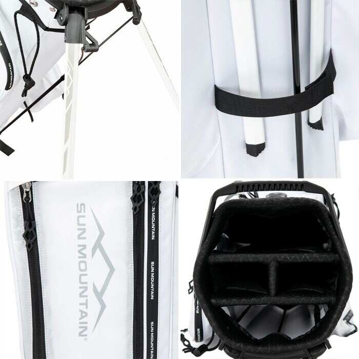 サンマウンテンならではの高い品質で幅広いユーザーに対応。止水ファスナー採用により急な雨にも対応可能。グローブホルダー、ドリンクホルダー搭載。Dカンを多く配置しタオルや距離計ケースなども吊り下げ可能。本体重量は 2.5kgの軽量設計。安定感抜群のオリジナルスタンドと簡単な着脱、フィット感に優れたショルダーベルト 「E-Z Lite Dual Strap」を採用し、プレー中や長時間移動時の持ち運びを快適にサポート。