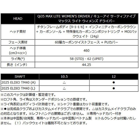 レディース テーラーメイド Qi35 MAX LITE ドライバー ELDIO TM40 カーボンシャフト 2025年モデル 日本仕様 Taylormade キューアイ サーティファイブ マックス ライト