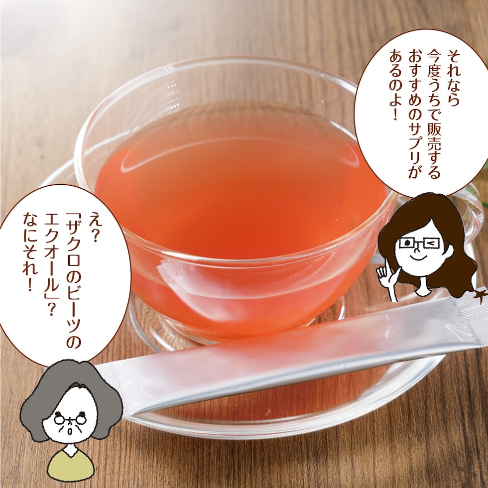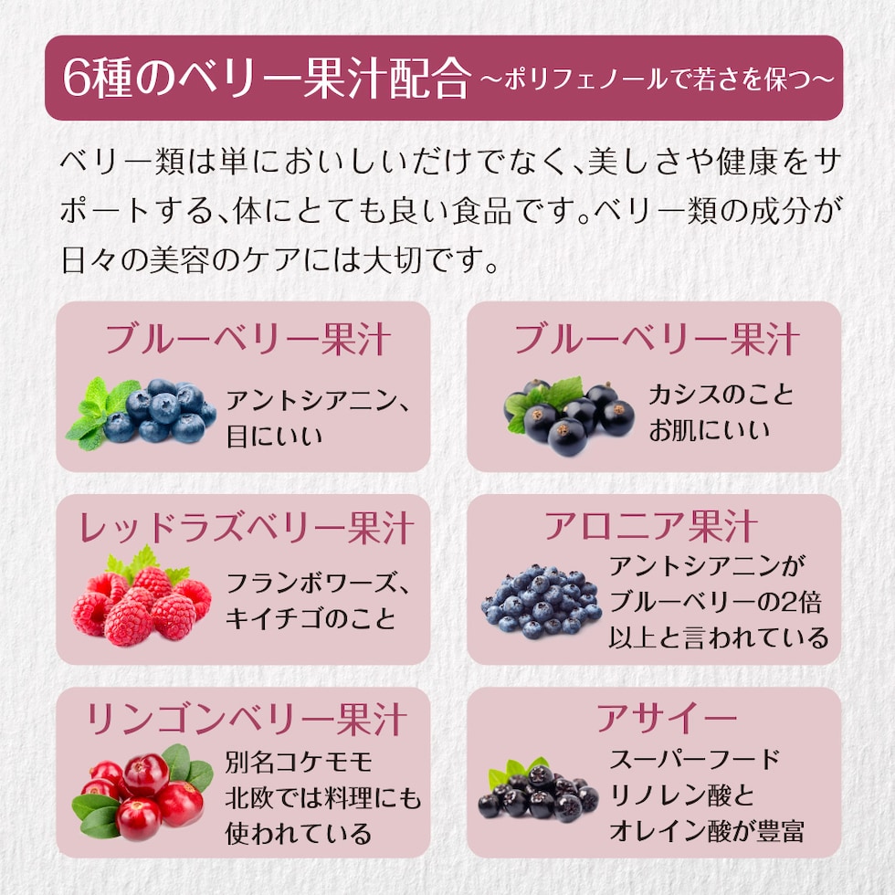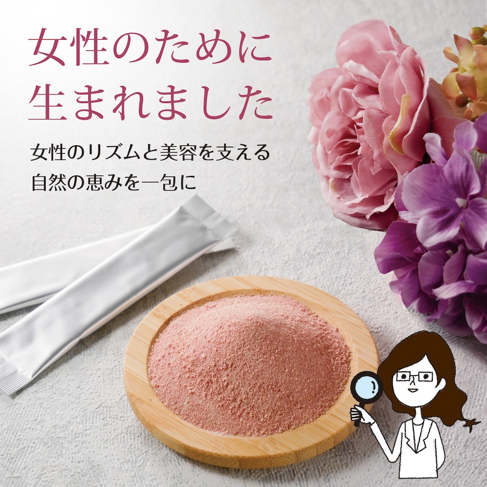 乳糖(乳成分を含む)(ドイツ製造)、ザクロエキス末(デキストリン、ザクロ果汁)、フィッシュコラーゲンペプチド(ゼラチンを含む)、ビートルート抽出物(ビートルート抽出物、デキストリン)、植物発酵エキス末(デキストリン、甜菜糖、黒砂糖、麦芽糖、ヨモギ、ウコン、ドクダミ、ハスの葉、高麗人参、その他)(大豆・バナナ・やまいも・りんごを含む)、果汁混合末(デキストリン、ブルーベリー果汁、ブラックカーラント果汁、レッドラズベリー果汁、アロニア果汁、リンゴンベリー果汁、アサイーエキス)、エクオール乳酸菌発酵エキス含有粉末(乳酸菌発酵エキス(黒糖・大豆胚芽培地、乳酸菌)、梅エキス、デキストリン、海洋深層水)(大豆を含む)/ビタミンC、クエン酸、甘味料(ステビア、アセスルファムカリウム)、香料