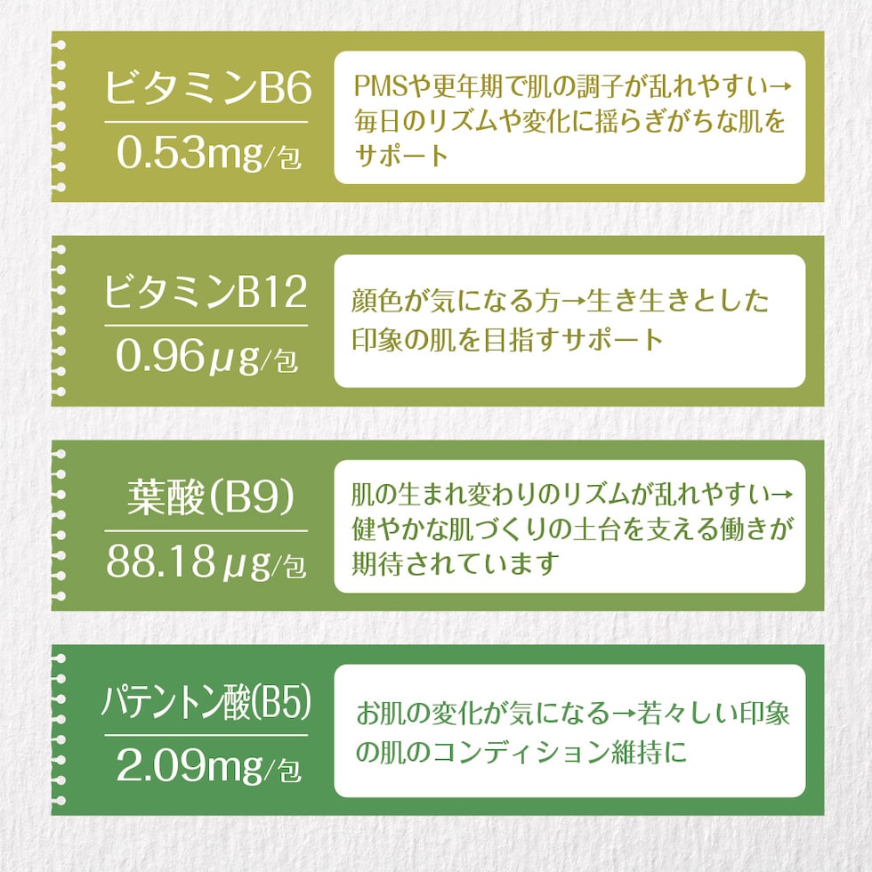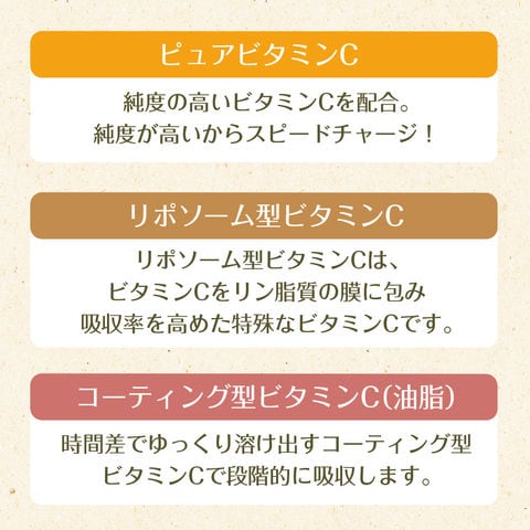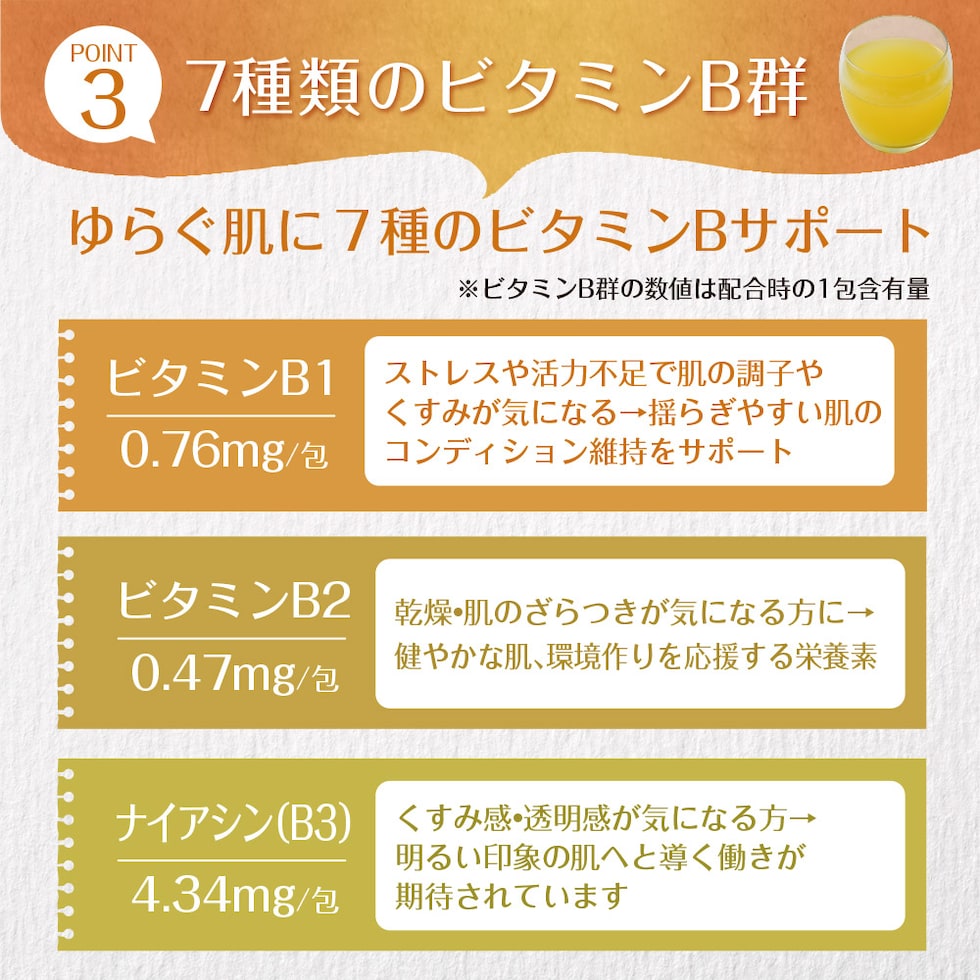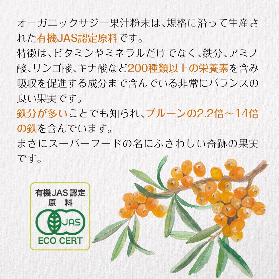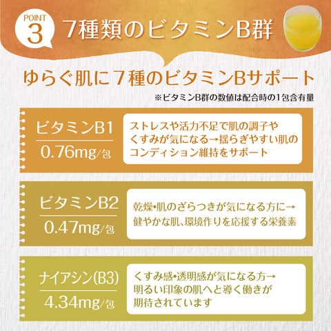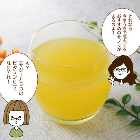 還元麦芽糖水飴(国内製造)、デキストリン、サジー果汁粉末(サジー果汁粉末、デキストリン)、コエンザイムQ10、ウコンエキス/ビタミンC、甘味料(ステビア)、微粒二酸化ケイ素、加工デンプン、香料、ヒマワリレシチン、抽出ビタミンE、ナイアシン、パントテン酸カルシウム、ビタミンB1、ビタミンB6、ビタミンB2、ビタミンA、葉酸、ビタミンD、ビタミンB12