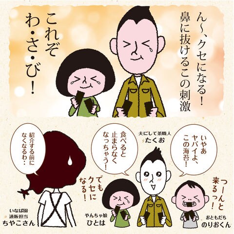 乾のり(有明海産)、砂糖、しょうゆ(大豆・小麦を含む)、水飴、エビエキス、食塩、かつお節エキス、たん白加水分解物(豚肉を含む)、みりん、こんぶエキス、わさび顆粒(乳・大豆を含む)/調味料(アミノ酸等)、香料、甘味料(ステビア)、香辛料抽出物、着色料(紅花黄、クチナシ)