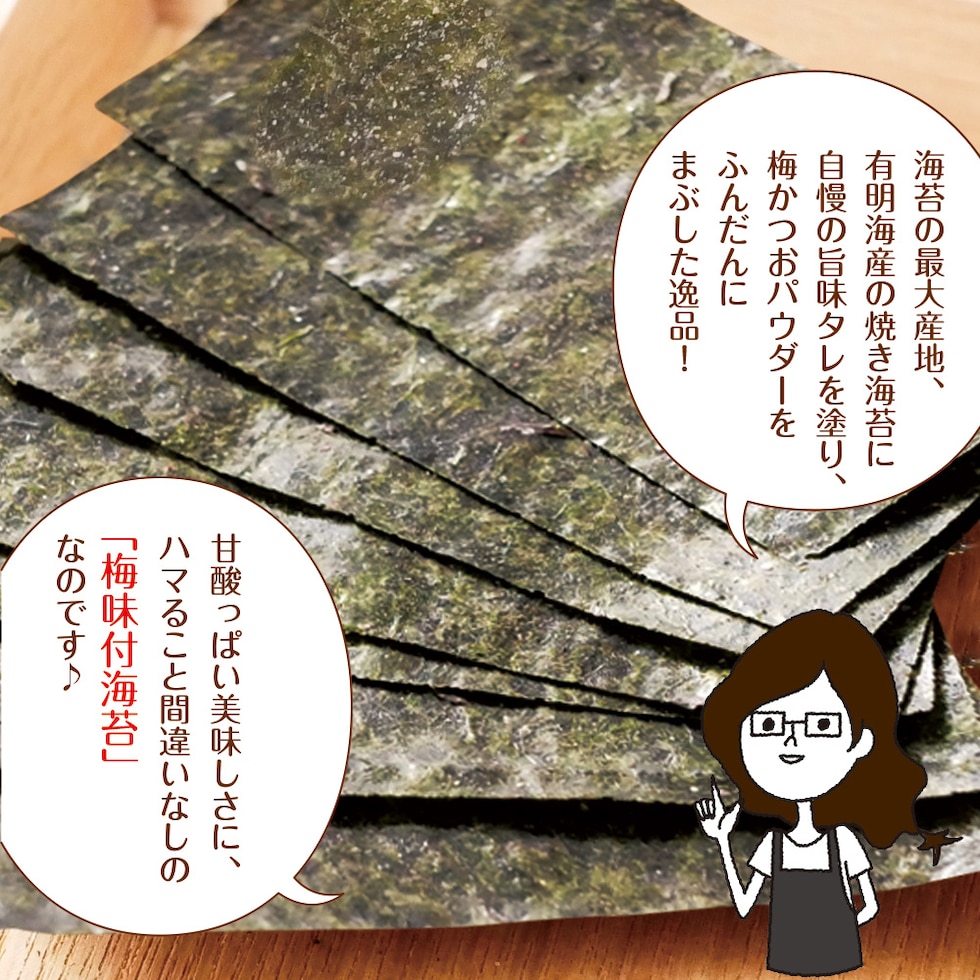乾のり(有明海産)、調味液(砂糖、醤油、魚介エキス、その他)、梅かつおシーズニング(砂糖、梅酢エキスパウダー、食塩、鰹エキスパウダー、粉末醤油、その他)、梅干しシーズニング(デキストリン、食塩、乾燥梅肉、砂糖、たん白加水分解物、昆布エキスパウダー)/調味料(アミノ酸等)、香料、酸味料、甘味料(ステビア、カンゾウ、スクラロース)、微粒二酸化ケイ素、着色料(カラメル)、香辛料抽出物、リン酸三カルシウム、(一部にえび・小麦・さば・大豆を含む)
