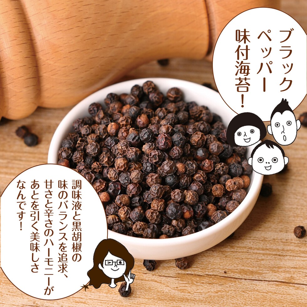 乾のり(有明海産)、調味液(砂糖、醤油、魚介エキス、その他)、ブラックペッパーシーズニング(香辛料(ホワイトペッパー、黒コショウ)、食塩、砂糖、蛋白加水分解物)/調味料(アミノ酸等)、香辛料抽出物、甘味料(ステビア、カンゾウ、スクラロース)、微粒二酸化ケイ素、香料、酸味料、(一部にえび・小麦・大豆を含む)