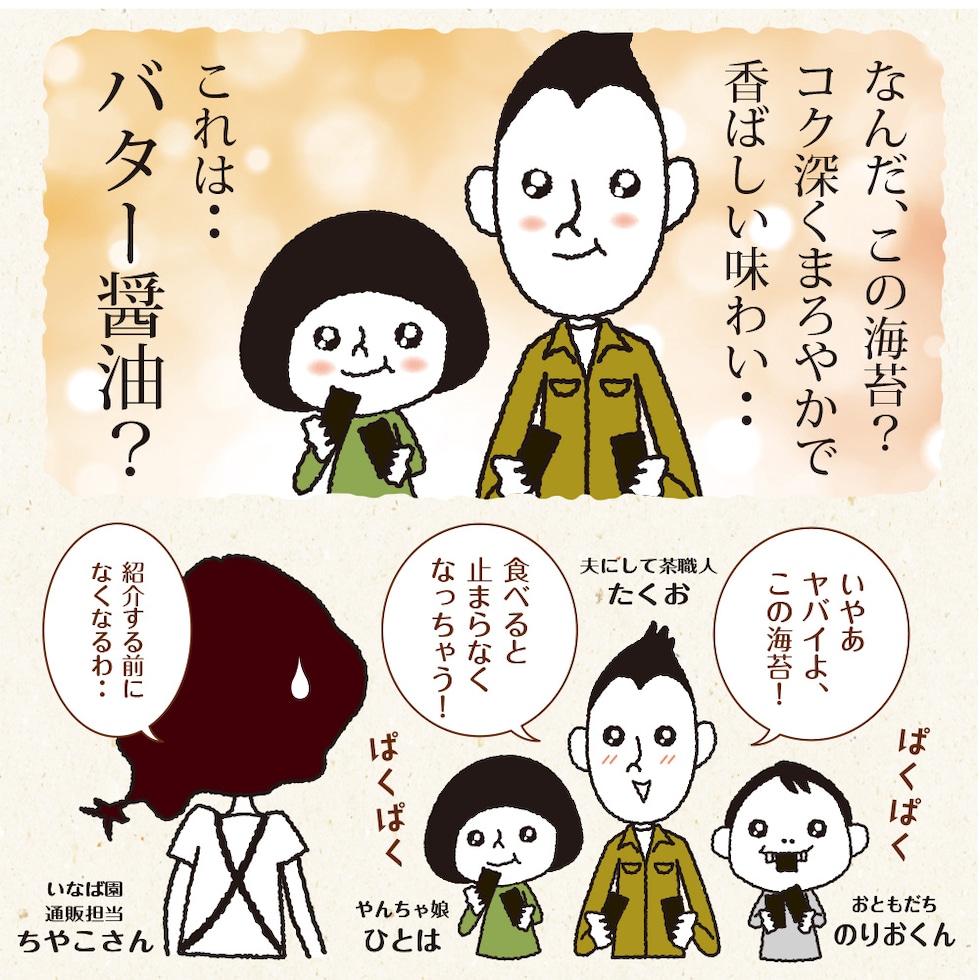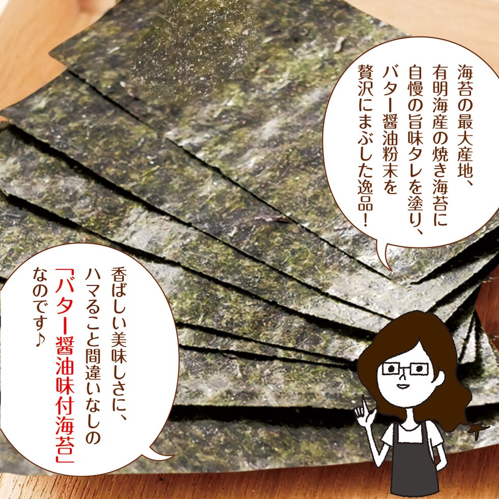 乾のり(有明海産)、調味液(砂糖、醤油、魚介エキス、その他)、醤油バターシーズニング(粉末醤油、ぶどう糖、食塩、魚介類エキスパウダー、砂糖、その他)/調味料(アミノ酸等)、香料、着色料(カラメル)、甘味料(ステビア、カンゾウ、スクラロース)、微粒二酸化ケイ素、香辛料抽出物、(一部にえび・小麦・乳成分・さば・大豆・鶏肉を含む)