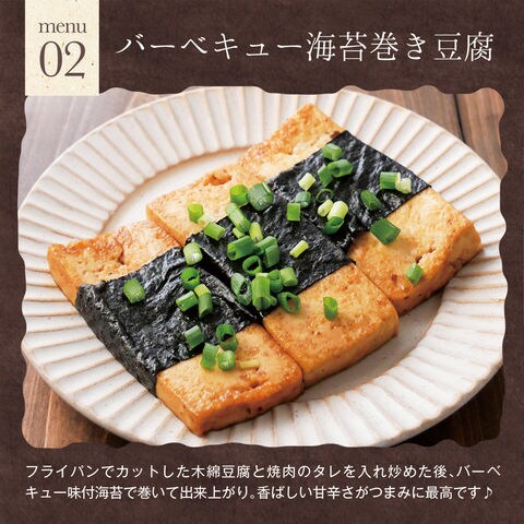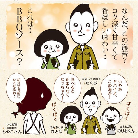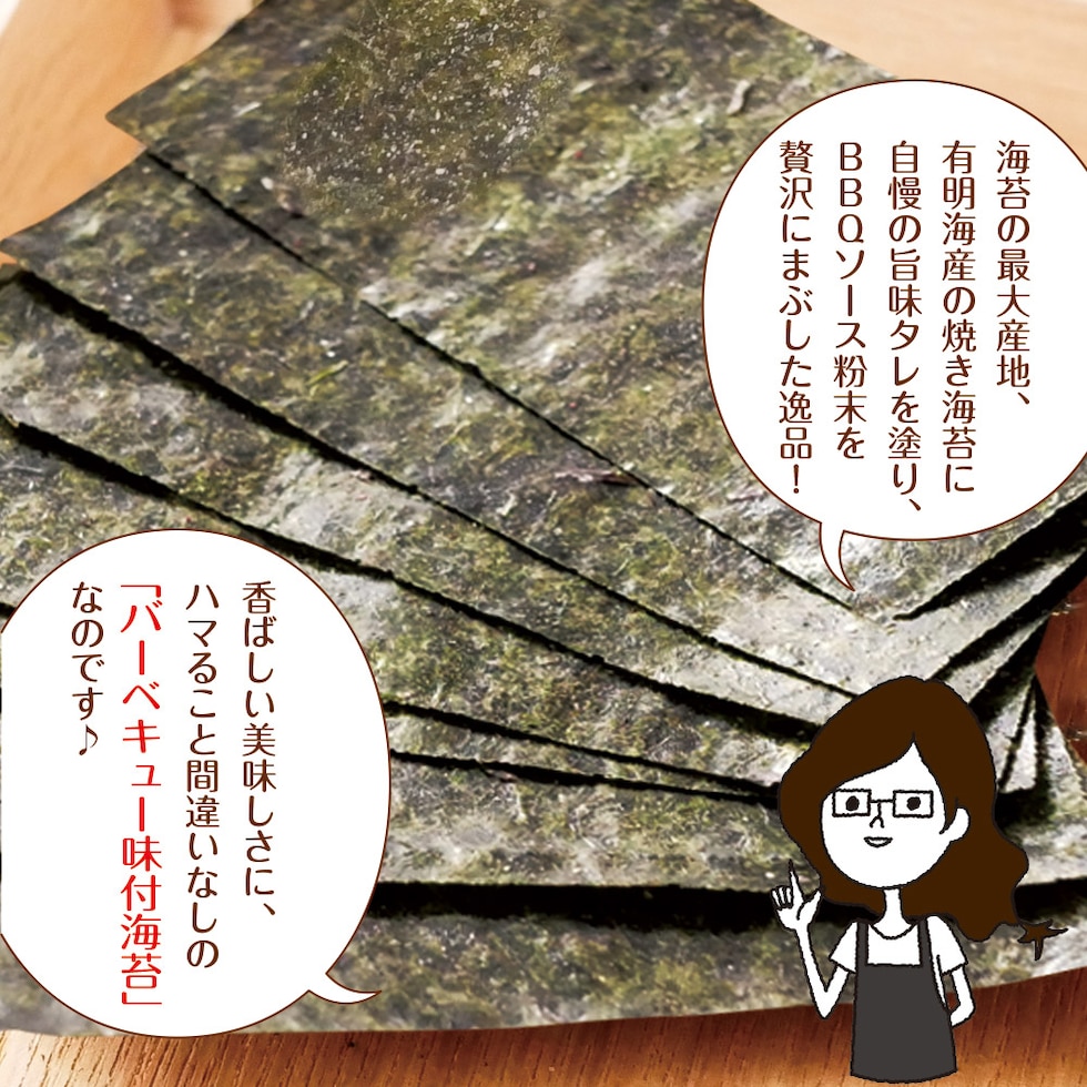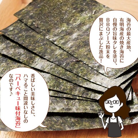 乾のり(有明海産)、調味液(砂糖、醤油、魚介エキス、その他)、バーベキューシーズニング(食塩、砂糖、蛋白加水分解物、トマト風味パウダー、粉末ソース、ガーリックパウダー、その他)/調味料(アミノ酸等)、香料、微粒二酸化ケイ素、甘味料(ステビア、カンゾウ、スクラロース)、着色料(カラメル、パプリカ色素)、酸味料、香辛料抽出物、くん液、(一部にえび・小麦・大豆・豚肉・りんごを含む)