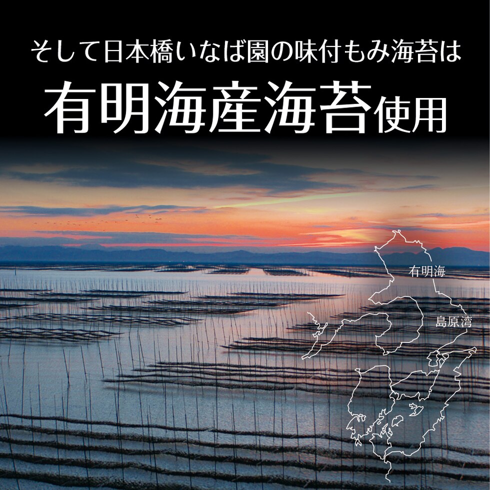 乾のり(有明海産)、砂糖、醤油、魚介エキス(こんぶエキス、かつお節エキス、えびエキス)、食塩、発酵調味料/調味料(アミノ酸等)、甘味料(ステビア、カンゾウ、スクラロース)、香辛料抽出物、(一部に小麦・えび・大豆を含む)