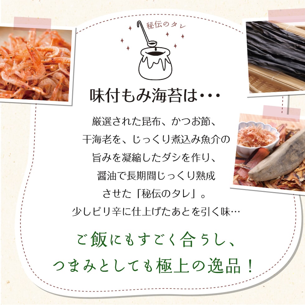 乾のり(有明海産)、砂糖、醤油、魚介エキス(こんぶエキス、かつお節エキス、えびエキス)、食塩、発酵調味料/調味料(アミノ酸等)、甘味料(ステビア、カンゾウ、スクラロース)、香辛料抽出物、(一部に小麦・えび・大豆を含む)