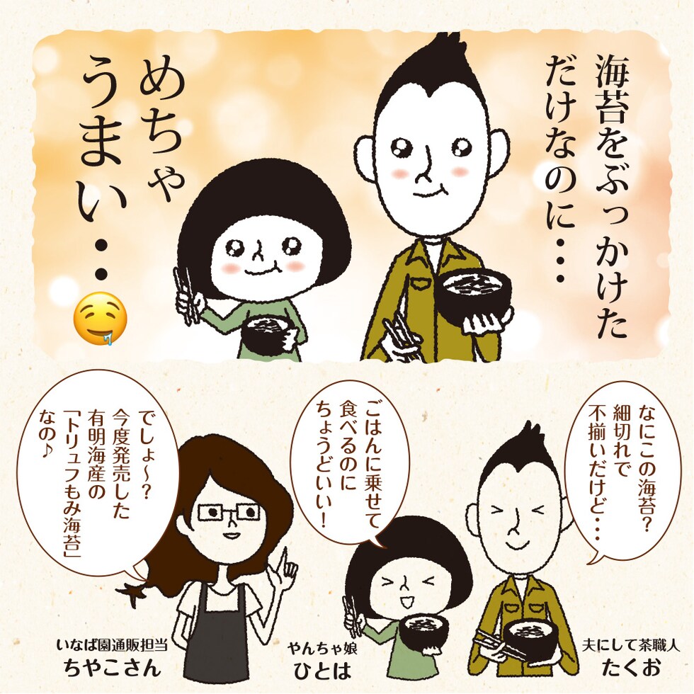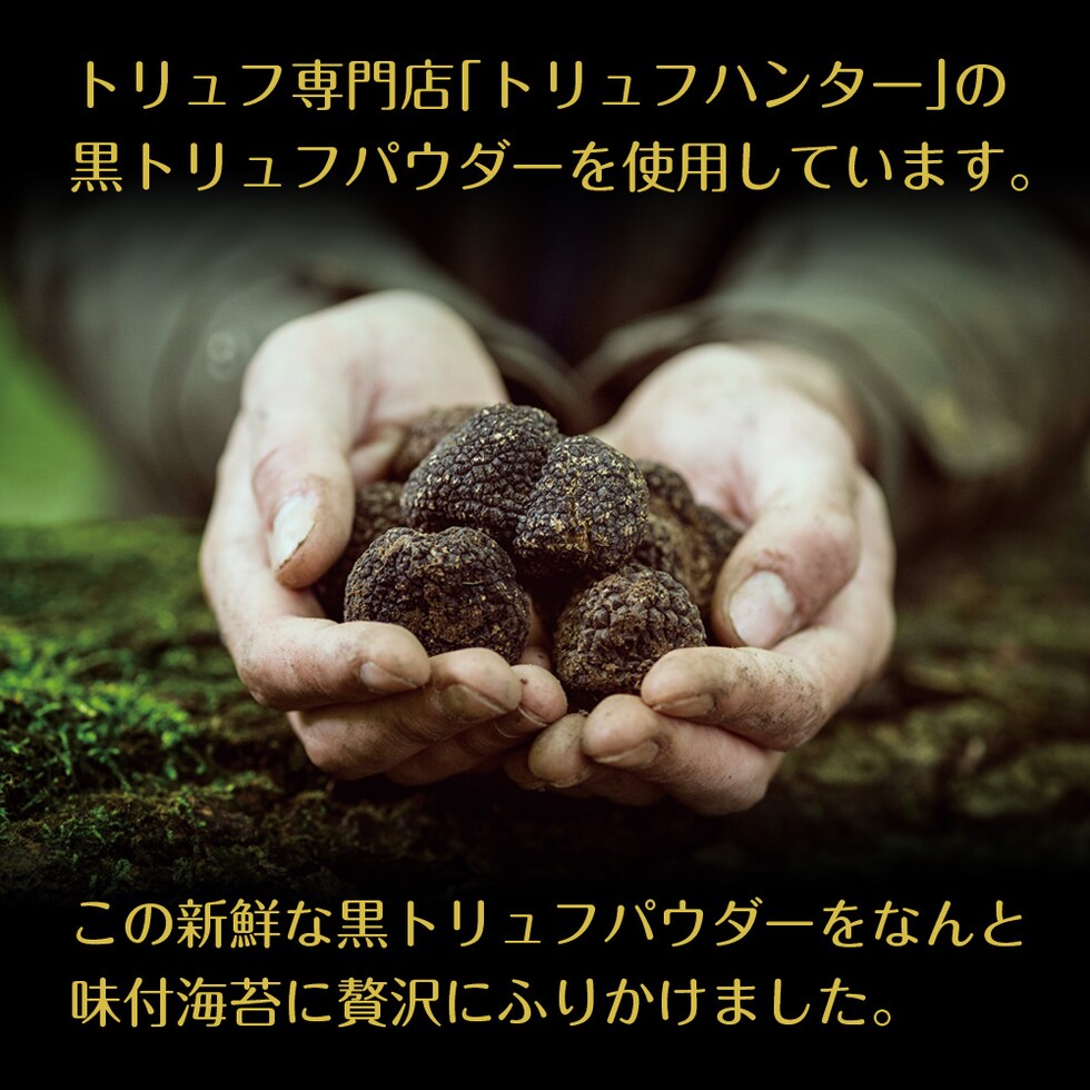 乾のり(有明海産)、トリュフ風味パウダー(食塩、イナゴマメ粉末、きのこエキス粉末、酵母エキス粉末、黒トリュフ粉末)、調味液(砂糖、しょうゆ、魚介エキス、食塩、発酵調味料)/香料、調味料(アミノ酸等)、甘味料(ステビア、カンゾウ、スクラロース)、香辛料抽出物、(一部にえび・小麦・大豆を含む)