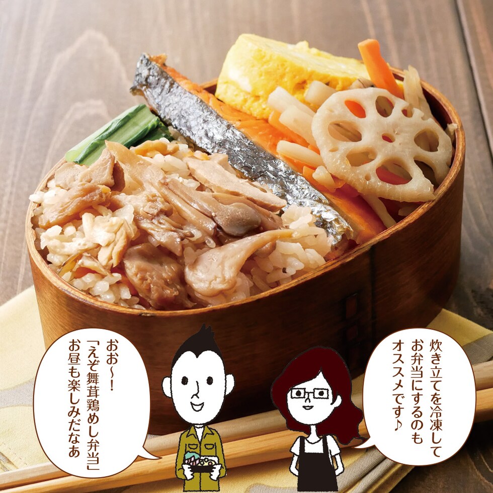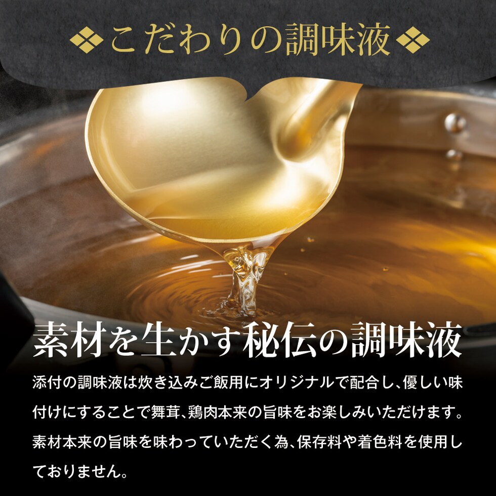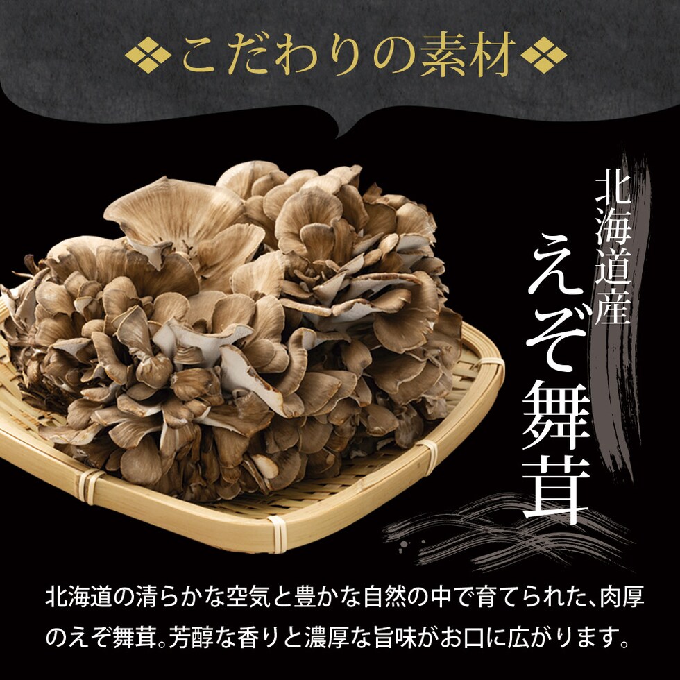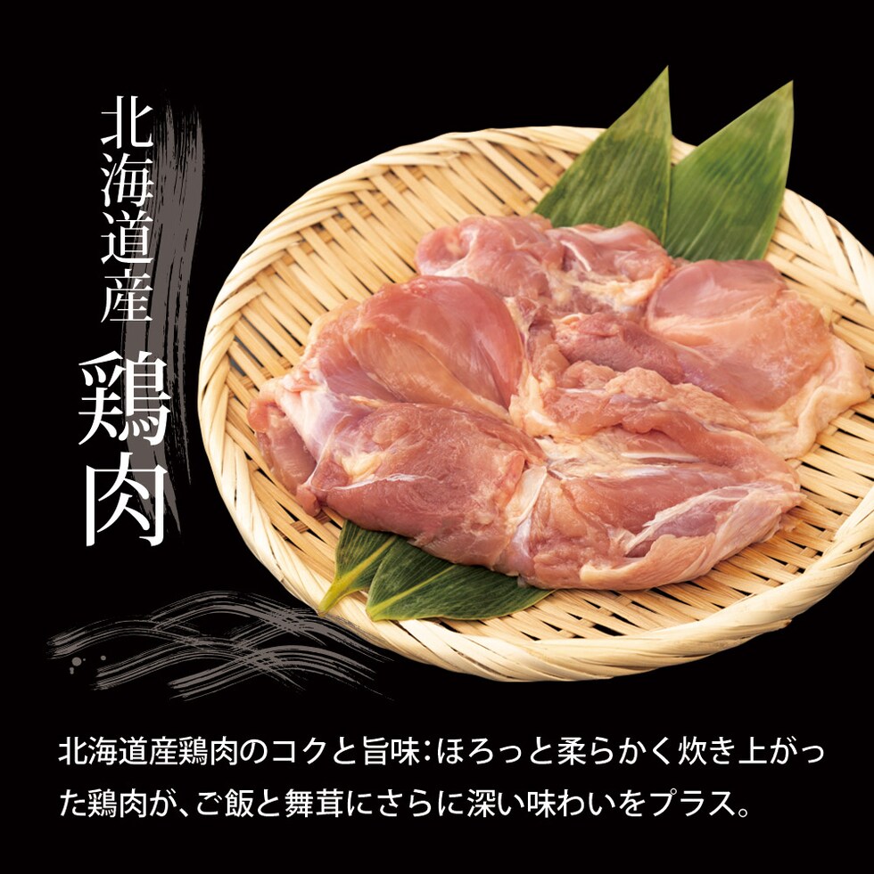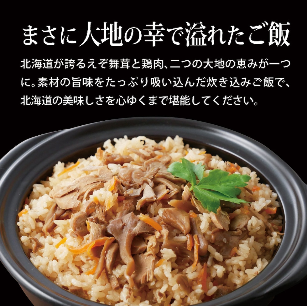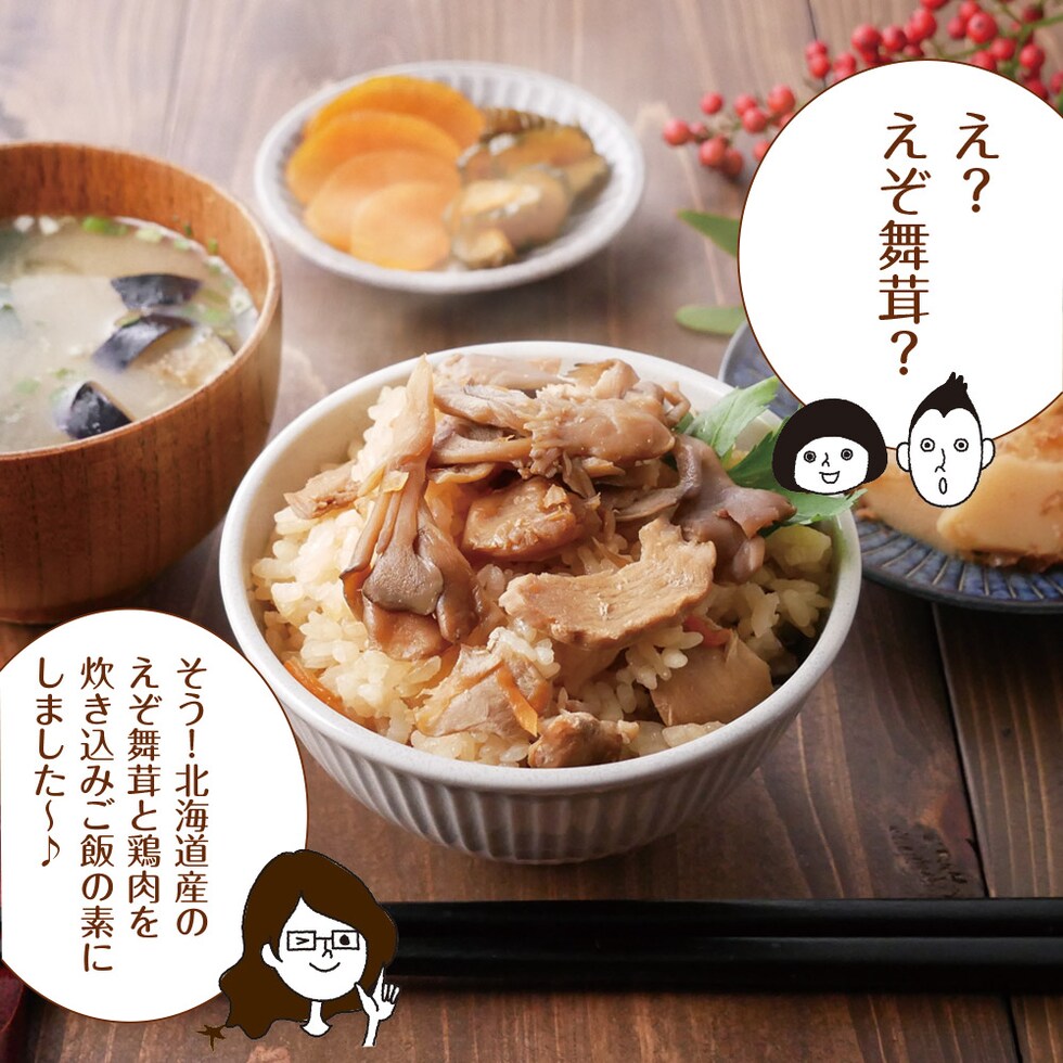 [具材]舞茸(北海道産)、鶏肉(北海道産)、醤油、人参、砂糖、発酵調味液、酵母エキス、(一部に小麦・大豆・鶏肉を含む)